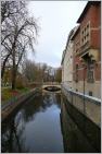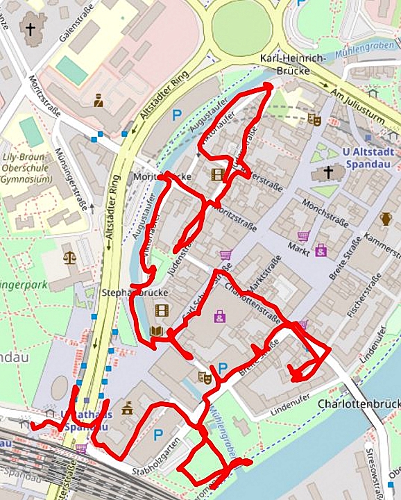 Direkt neben dem Postgebäude treffen wir wieder auf den Mühlengraben. Eine Wassermühle auf der gegenüberliegenden Seite hatte bis 1962 das Korn für die Spandauer Bauern gemahlen. Vor dem Graben stand bis 1907 das Potsdamer Tor in einem Knick zur Straße. Das richtete sich nach der Bastion der Stadtbefestigung aus, hatte aber auch den Vorteil, so wird berichtet, dass man vom Tor nicht in die Straße hineinschießen konnte. Im abergläubischen China hätte man die Ausrichtung vielleicht so erklärt, dass Geister, die nur schnurgeradeaus laufen können, nicht in die Straße gekommen wären.