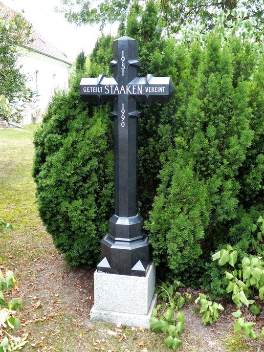 Die Enttäuschung darüber, von einer westlichen Besatzungsmacht verschoben worden zu sein, wirkt bis heute nach. Viele Staakener verließen ihre Heimat und zogen nach West-Berlin. Ein schwarzes Kreuz vor der Dorfkirche hält die Erinnerung wach "1951 geteilt - 1990 vereint". In der Dorfkirche ruft ein Wandgemälde "Versöhnte Einheit" dazu auf, den Schmerz zu überwinden. Im Kirchgarten haben zwei Stifterinnen aus "West-Staaken im Osten" und aus "Ost-Staaken im Westen" gemeinsam einen "Baum der Versöhnung" gepflanzt.