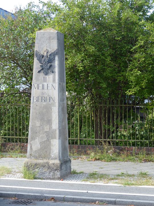 Wenn ein Meilenstein wandert, dann muss das schon eine besondere Bewandtnis haben. So ist es auch mit dem Meilenstein, der am Nennhauser Damm "III Meilen bis Berlin" anzeigt, bekrönt von einem preußischen Adler. Erstmalig aufgestellt wurde der Stein 1832 an der "Neuen Hamburger Chaussee" im benachbarten Dallgow zu einer Zeit, als man Straßenentfernungen noch in Meilen gemessen hat (1 Meile = 7.53248 km). Im Jahr 1875 wurde das metrische System eingeführt, jetzt setzte man die Ganzmeilensteine in Abständen von 10 km um, änderte aber nichts an der Entfernungsangabe.