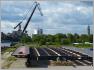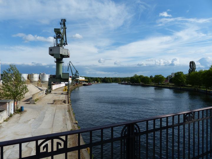 Von der Schulenburgbrücke über die Havel kann man das Hafengelände überblicken. Nach Norden schaut man zurzeit auf die dort am Ufer liegende, vormontierte Fahrbahn der Freybrücke, die darauf wartet, zur Baustelle verschifft zu werden. Die Bögen sind dort bereits montiert, das Nadelöhr mit der Behelfsbrücke an der Heerstraße zwischen Charlottenburg und Spandau wird dann hoffentlich bald beseitigt sein.