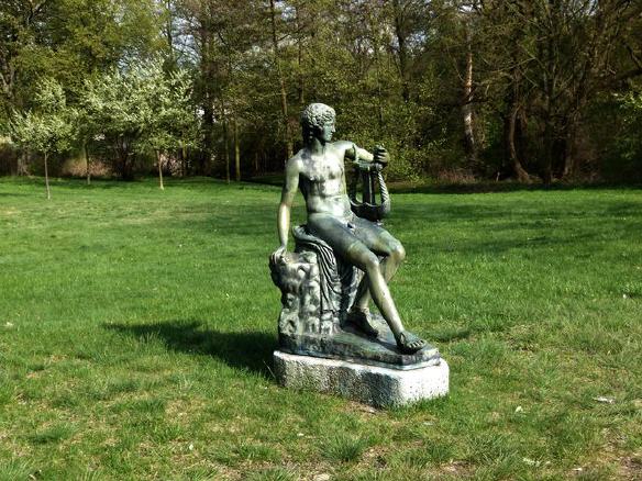 Zwei Wasserflächen flankieren den Zugang von Pichelsdorf in die Wilhelmstadt: der Grimnitzsee mit Zugang zu Havel und der See im Südpark. Am Grimnitzsee wird der Besucher von der Bronzefigur des (sitzenden) Apolls mit Kithara begrüßt. Über Künstler und Entstehungszeitraum der hier aufgestellten Plastik ist nichts bekannt, es gibt aber ein antikes Vorbild, die Marmorfigur des (stehenden) Apollo Kitharoidos. Die römische Statue aus dem 2.Jahrhundert wurde von Friedrich dem Großen erworben und wird heute auf der Museumsinsel ausgestellt. Darüber ist die Bronze am See mit der Berliner Geschichte verknüpft. Vielleicht dachte der Schöpfer auch daran, dass der nackte Apollo zwischendurch sein Musikinstrument aus der Hand legt und sich im Wasser erfrischt.