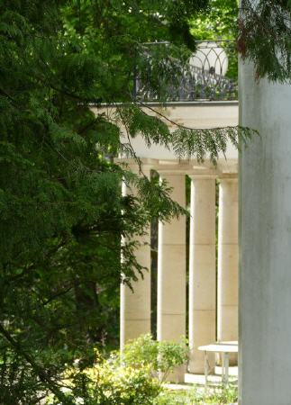 In dem japanisch inspirierten Wasser- und Staudengarten im Garten finden sich barocke Putti und eine Sandsteinplatte mit Kreuzigungsszene, in der Umfassungsmauer mehrere Reliefs.
