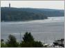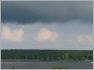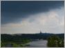 Zu dem Seeburger Zipfel gehörte auch die Haveldüne, die in Wirklichkeit keine Düne ist, sondern eine eiszeitliche Aufschüttung. Während der Blockade wurde hier Kies abgebaut, um Baumaterial für die eingeschlossene Stadt zu gewinnen. Die Schienen für die Loren gingen von der Höhe bis zum Wasser, dort wurde der Kies auf Schiffe umgeladen. Die Düne wurde aber nur vorübergehend genutzt und nicht vollständig abgebaggert, das Schicksal mancher Weinberge und anderer Erhebungen blieb ihr erspart (3). Heute haben wir von hier einen weiten Ausblick über die Havel und die gegenüberliegenden Ufer. Der Himmel inszeniert eine friedliche Schicht von weißen Wolken auf hellblauem Hintergrund, darüber braut sich unheilvoll in dunklen Wolken ein Unwetter zusammen. Was für ein Blick!