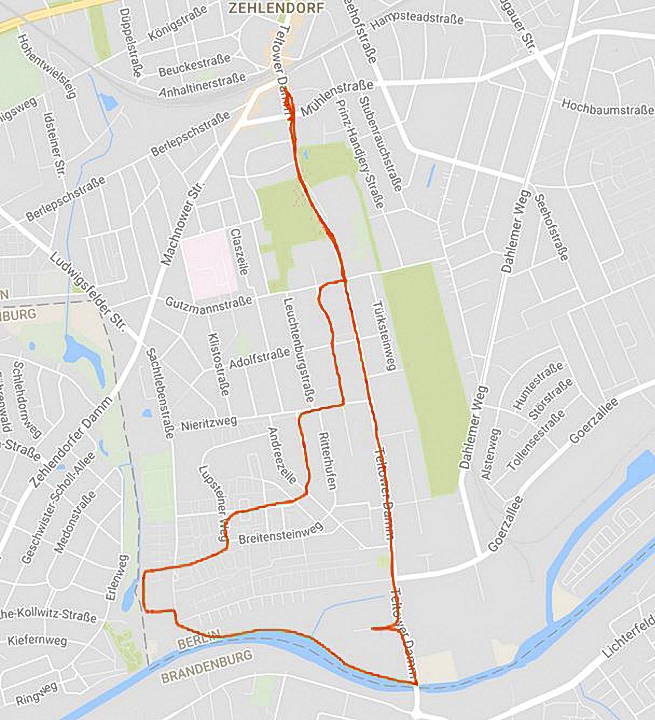 Zwei Bildungseinrichtungen (Kirchliche Hochschule, John-F.-Kennedy-Schule) und drei Parks (Heinrich-Laehr-Park, Schweizerhofpark, Schönower Park) könnte man auf dem Rückweg nach Zehlendorf-Mitte noch besuchen, aber inzwischen sind die Füße sehr müde. So nehmen wir den Bus, um weiter nördlich am Teltower Damm bei einem Italiener einzukehren.