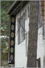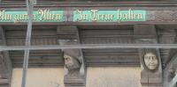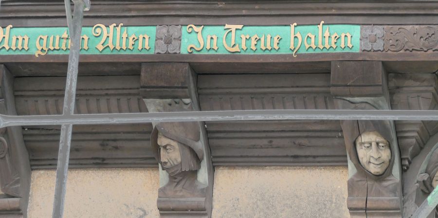 Das Haus ist gerade von einem Baugerüst umgeben, Inschrift und Schnitzereien sind aber sichtbar geblieben.