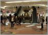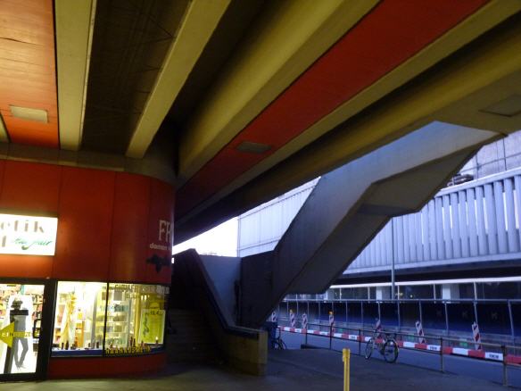 Als "einheitsstiftende Geste" nach dem Palast der Republik auch das ICC und den Bierpinsel abzureißen (der Vorschlag stand im Tagesspiegel) ist die beliebte jahrhundertelange Berliner Abreißen-Neubauen-Haltung, da ist eine Kunstaktion der neuen Eigentümerin weniger radikal: Sie will street-art auf einer Wachsschicht auftragen lassen, ein vorübergehendes Graffiti, das die rote Farbe überdeckt, die aber wieder hervorgeholt werden kann. Etwas tiefer, in der "unterirdische Parallelwelt" des U-Bahnhofs, wurde das Kunstprojekt "von hier aus ins Imaginäre und wieder zurück" eröffnet. Wie schön, dass die Nachkriegsmoderne die Gegenwart beschäftigt.