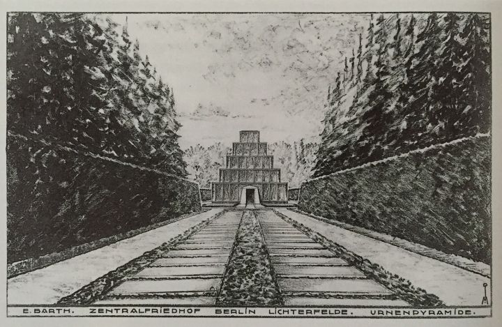 Der Berliner Stadtgartendirektor Erwin Barth hatte einen Teil der Entwürfe geliefert, die aber nicht ausgeführt wurden oder durch spätere Änderungen überlagert sind. Schade, denn seine "Urnenpyramide" ist eine ungewöhnliche Anlage. Ein Weg mit einer baumbestandenen Sichtachse sollte auf einen Platz zuführen, auf dem ein pyramidenförmiges Kolumbarium über 10.000 Urnen aufnehmen konnte.