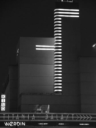 Dazwischen liegt der Titania-Palast, dessen historische Rolle als FU-Gründungsort, Konzertsaal der Philharmoniker, Auftrittsort des Magiers Kalanag ("Wasser aus Indien"), der aus einem Gefäß jedes beliebige Getränk von Cola über Kaffee bis zu blauer Tinte nacheinander ausgießen konnte. Die klar gegliederte Fassade mit dem Lichtkunstwerk ist für mich immer noch die Mutter aller Gebäude-Lichtinstallationen wie z.B. an meinem Lieblingshaus in der Friedrichstraße.