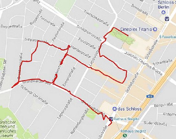 Von hier aus ging Kafka - schwer tuberkulosekrank - gern im Stadtpark Steglitz spazieren. Einmal traf er ein weinendes kleines Mädchen. Es hatte seine Puppe verloren und war sehr verzweifelt. Kafka erzählte dem Mädchen, dass die Puppe ihm geschrieben hätte, dass sie verreisen würde, den Brief hätte er zu Hause. Seine Freundin Dora Diamant hat in einem Interview beschrieben, wie es weiter ging: Die Korrespondenz soll drei Wochen gedauert haben, in denen die Puppe größer wurde, in die Schule kam, neue Leute kennen lernte - und das Mädchen immer wieder ihrer Liebe versicherte. Am Ende soll Kafka sogar ein Happy End geschrieben haben, sein einziges: Die Puppe hatte einen Mann kennen gelernt und geheiratet und konnte deshalb nicht zu dem Mädchen zurückkehren.