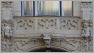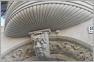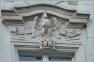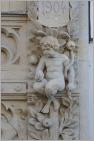 Der Götterbote Hermes blickt vom Hauseingang herunter, flankiert von zwei sitzenden Putten. Am Nachbarhaus schaut ein Faun unter einer muschelförmigen Balkonunterseite auf den Eintretenden herab.