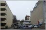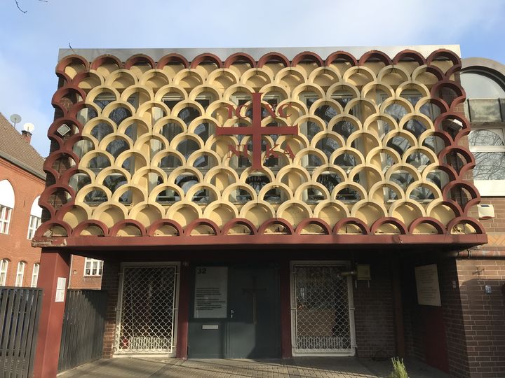 An der erweiterten Gasse sind historisierende Altbauten zu finden. Weiter südlich steht ein Kitaneubau zur Rechten und ein Gemeindehaus-Backsteinbau zur Linken, und dann wird es krass: Unvermittelt kommt ein kubischer Kirchenbau der 1970er Jahre in den Blick, dessen Fassade aus halbrunden Betonsteinelementen besteht, die anderswo als Pflanzringe dienen könnten.