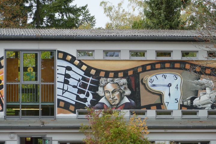 Der Schulhof der Grundschule am Königsgraben ist direkt von der Straße einsehbar. Er ist umrahmt von dem Schulgebäude mit Wandgemälden, die als Comic gestaltet sind. Ich fotografiere die Bilder vom Bürgersteig aus. Die Schüler haben Pause, mehrere fragen, was ich da mache und sind zufrieden mit der Auskunft, dass ich mich für die Wandbilder interessiere.