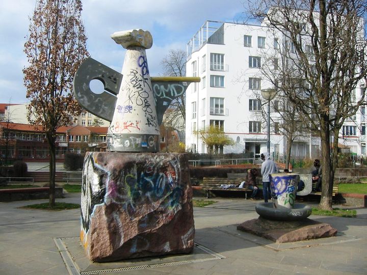 Ein Berliner Brunnen ist sogar erst auf der documenta in Kassel ausgestellt worden, bevor er - sprühend vor Witz - das Neubaugebiet der IBA 1984/87 an der südlichen Friedrichstraße erreichte. Aus einer Nichtgeburtstagskaffeekanne (so der Name des Brunnens) ergießt sich ein Wasserstrahl in die daneben stehende Tasse. Im Theodor-Wolff-Park kann man diese Schöpfung von Professor Heinrich Brummack sehen, die verspielt, ironisch und leicht subversiv hervorragend zu den Postmoderne-Bauten der IBA passt.