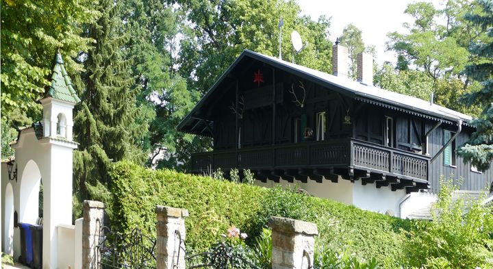 Am Beginn der Lutherstraße treffen wir als erstes auf ein Schweizerhaus mit durchgehendem hölzernen Balkon, das aus der Entstehungszeit der Villenkolonie kurz nach 1900 stammt. An der Kanalstraße taucht eine Backsteinburg auf, die "Villa Burgfrieden" mit Zinnen und umlaufenden Blendfriesen. Ein ungewöhnlicher Bau, über dessen Architekten Larisch (Vorname unbekannt) keine weiteren Informationen online zu finden sind.