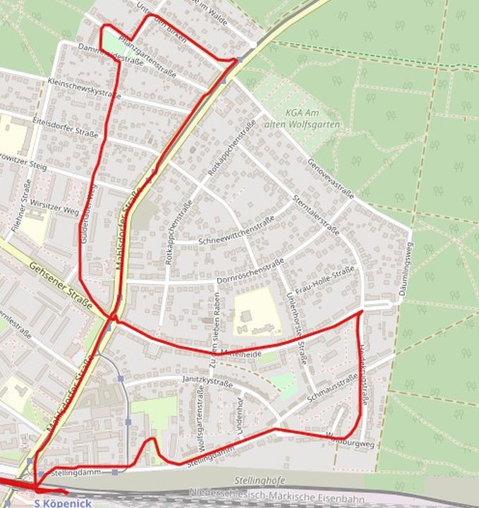 Unser letztes Ziel ist heute die Siedlung Uhlenhorst weiter nördlich, die schon an Mahlsdorf angrenzt. Ohne öffentliche Verkehrsverbindungen war um 1910 eine Siedlung nicht zu vermarkten, private Automobile standen den Familien nicht zur Verfügung. Elsengrund und Mittelheide waren zu Fuß vom Bahnhof Köpenick zu erreichen, der bereits 1842 an der Bahnstrecke nach Frankfurt/Oder eingerichtet worden war, aber Uhlenhorst? Seit 1907 fuhr eine Straßenbahn vom Bahnhof Köpenick nach Mahlsdorf, sie wurde als "Wüstenbahn" verspottet, aber sie machte die Erschließung Uhlenhorsts möglich.
