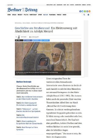 Die Berliner Zeitung berichtet am 15.07.2018 in ihrer Serie: Berliner Denkmale, Geschichte am Straßenrand über einen "Elektrozwerg mit Ähnlichkeit zu Adolph Menzel" und bezieht sich dabei auf unsere "verdienstvolle Heimatkunde-Internetseite":