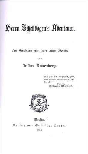 Auch nach Kreuzberg verschlug es Herrn Schellbogen. "Heut ein Häusermeer, damals aber noch völlig unbebaut", durch Staub und Felder näherte er sich seinem Ziel. "Damals waren diese Gegenden noch wenig bekannt, sie waren einsam, spärlich besucht, und man glaubte weit weg von Berlin zu sein, wenn man innerhalb ihrer sandigen Schluchten umherirrte". Schellbogen genoss, "wie es stiller und stiller ward von dem Lärm der Hauptstadt, der in der Ferne verhallte, man hörte die Lärche jubeln". Hier verschmelzen Julius Rodenberg und seine Romanfigur Traugott Schellbogen zu einer Person. Von seiner Wanderung nach Heinersdorf im Norden Berlins hatte Rodenberg selbst berichtet, "hier ist endlich kein Berlin mehr, nur sandiger Hügel, und eine Lerche schwirrt über den Feldern und singt" (3). Rodenberg und seine Romanfigur wohnten an der Potsdamer Straße, Rodenberg nahe dem heutigen Kulturforum. In die Königstraße zieht es nicht nur Schellbogen, auch sein Schöpfer Rodenberg beobachtet die Königstadt ausgiebig.