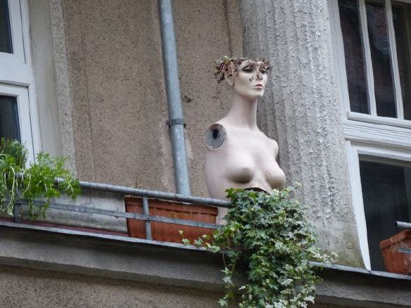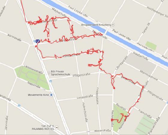 Schon seit der Gründung Groß-Berlins wird die Fahnenstange am Roten Rathaus von den Statistikern als Stadtmittelpunkt bezeichnet, doch wo ist die geografische Mitte? Stellt man sich den Stadtgrundriss als Laubsägearbeit vor und hält auf einem Zeigefinger diese Fläche in der Waage, dann hat man den geografischen Mittelpunkt gefunden. Mit einem Computermodell wurde aus 3.745 Punkten der Stadtgrenze ermittelt, dass sich dieser Flächenmittelpunkt in der Alexandrinenstraße 12-14 in Kreuzberg befindet. Eine amtliche Hinweistafel wurde aufgestellt. Und nun hat ein studierter Geograf und pensionierter Leiter des Potsdamer Planetariums "einfach aus Spaß" den geografischen Mittelpunkt neu berechnet und ihn ganz anders verortet. Mit Google Maps hat er die längste Nord-Süd-Ausdehnung und die längste Ost-West-Ausdehnung halbiert, und plötzlich ist das unspektakuläre Haus Spremberger Straße 4 im Reuterkiez der Mittelpunkt Berlins. Jedenfalls hat dort das Navi unseres Geografen verkündet: "Sie haben ihr Ziel erreicht". Den Hauseigentümer hat’s gefreut, er hat naive Stadtbildchen an die Fassade malen lassen, deren Sinn sich aber erst erschließt, wenn man diese Geschichte kennt.