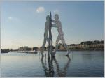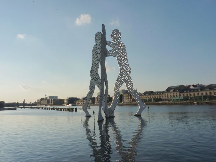 Molecule Man Weithin sichtbar und vom Sonnenlicht reflektiert steht in der Spree gegenüber dem Osthafen die Figur "Molecule Man". Die Silhouetten von drei Männern in Schrittstellung, die sich an den Händen und Füßen berühren, sind im gleichen Kreisabstand von 120 Grad miteinander verbunden. Die Einzahl "man" im Titel sagt, dass es sich um drei Fassungen desselben Mannes handelt: Die dreifache Figur im Schnittpunkt der Stadtteile Kreuzberg, Treptow und Friedrichshain steht symbolisch für die Wiedervereinigung.