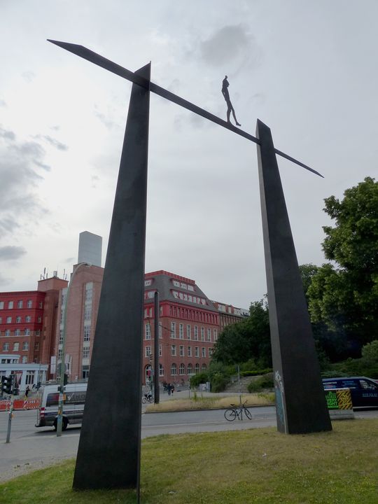 Balance Über unseren Köpfen balanciert ein Seiltänzer in 13 Meter Höhe auf einer Stahlkonstruktion. Die Installation am "Prenzlauer Tor" (Prenzlauer Allee Ecke Prenzlauer Berg) steht für die Balance zwischen Denken, Handeln und Sein, für die vielfältigen Probleme, die der Mensch gleichzeitig zu bewältigen hat. Zu diesem Thema hat Hubertus von der Goltz nicht nur in Berlin, sondern auch in anderen Städten Gratwanderungen in luftiger Höhe inszeniert.